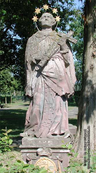 | Statue des Johannes Nepomuk am Gemeindegarten Sie wurde 1769 durch den Bildhauer Josef Kaltenbach von Treyberg erschaffen. Das am Sockel vorhandene Wappen zeugt von der Stiftung der Heiligenfigur durch die Prinzessin Elisabeth von Baden-Baden, die im Riegeler Schloß, erbaut als Sommerresidenz, wohnte. Bis zum Bau des Leopoldskanals 1837 bis 1842 verlief an dieser Stelle das damalige Ufer der Elz.