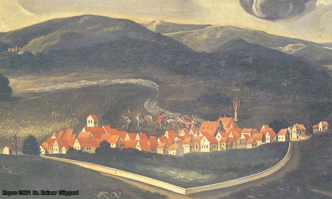 Die Dorfmauer - auf der Darstellung ist sie links ab dem Käppele und dem damaligen Schäfertor (nicht sichtbar) zu erkennen. Sie folgt dann in etwa dem heuten Verlauf der Hauptstraße, entlang der heute noch vorhandenen Gartenmauer des Kinderheims. Sie biegt bei der heutigen Eimündung der Kehnerstraße in die Hauptstraße rechtwinkling ab und folgt weiter der Gartenmauer des Heims. Die Darstellung endet im Bereich des Drollbergs.